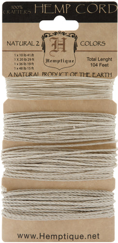 HEMPTIQUE- Hemp Cord. Natural Hemp Cord is the preferred choice for use in crafts including jewelry making, scrapbooking, handmade cards, gardening and more! Hemp Cord is a natural biodegradable and eco-friendly alternative to cotton and synthetic cordage. This package contains 104 feet of hemp cord: 41 feet of 10-lb hemp cord, 29 feet of 20-lb hemp cord, 19 feet of 36-lb hemp cord, and 15 feet of 48-lb hemp cord. Imported.