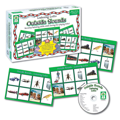 Encourage listening skills with Listening Lotto: Outside Sounds. To play this game, students listen to the sounds on the CD and place tokens on the images on their game cards that match what they hear. This game set supports NCTE and NAEYC standards and includes: 12 game cards (5.5" x 8.5" each) with 8 photos per card, 120 game tokens, an audio CD, and directions in English, Spanish, and French.