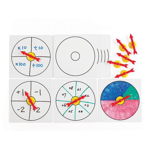 Make your own spinner dice or invent your own games! Ideal for classroom work on probability. The whiteboards are printed with concentric circles which provide a template for easy subdivision by the user for use in mathematical exploration including probability, place value, random number generation and much more. Set includes 10 wipe-clean whiteboards (7.87" square) and 10 suction spinners with 3.94" arrows.