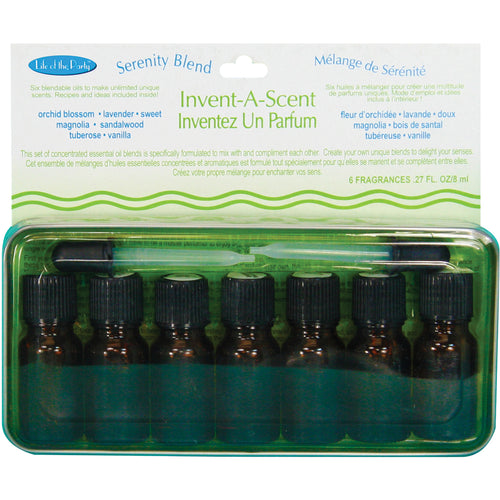 LIFE OF THE PARTY-Invent A Scent Blendable Fragrances. Put your nose to the test and create your very own fragrance. Package includes six .27 fl. oz. fragrances (Lavender, Sweet Magnolia, Orchid Blossom, Tuberose, Sandalwood, and Vanilla), two droppers, and recipes/ideas. Made in USA.
