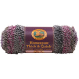 LION BRAND-Homespun Thick & Quick. Make a statement with Homespun Thick & Quick! This super-bulky version of fan-favorite Homespun yarn works up quickly into richly textured afghans and silky-soft accessories. This beautiful yarn features both heathers and slowly striping painterly shades so you're sure to find the color you love. Weight category: 6. Content: 88% acrylic, 12% polyester, 8oz/227g, 160yd/146m. Knit gauge: 8st x 12r = 4in/10cm on size US-13/9mm needles, Crochet gauge: 6sc x 8r = 4in/10cm with US-15/P/10mm hook. Care: machine wash, tumble dry, do not bleach, do not iron. Dyelotted-- we try but cannot guarantee matching dyelots. Made in USA.
