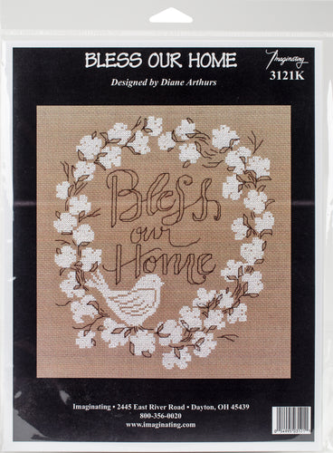 Unique, quality patterns that are based off of one-of-a-kind artistic works! This package contains 14 count brown fabric, floss, one needle, one layout page and easy to follow instructions. Design: Bless Our Home. Finished size: 8x9 inches. Designer: Diane Arthurs. Made in USA.