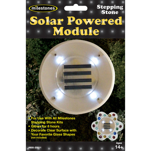 MILESTONES-Solar Powered Module. This solar powered module can be used with all Milestones Stepping Stone Kits and will turn an ordinary homemade stepping stone into a subtle light for your garden path. It has a diameter of 4 inches, a height of 1 inch, and will glow for up to 8 hours. This package contains one solar powered module. All stepping stone kits sold separately. Imported. Conforms to ASTM D4236. WARNING: This product can expose you to Silica Crystalline (airborne particles of respirable size), which is known to the State of California to cause cancer. For more information go to www.P65Warnings.ca.gov
