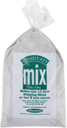 This mix is enough to create one 12 inch stepping stone or two 8 inch stones. Just mix with water and pour into a mold. This package contains 7 pounds of stepping stone mix. Tools, mold, decorations not included. Made in USA. Conforms to ASTM D4236. WARNING: Choking Hazard. WARNING: This product can expose you to Silica Crystalline (airborne particles of respirable size), which is known to the State of California to cause cancer. For more information go to www.P65Warnings.ca.gov