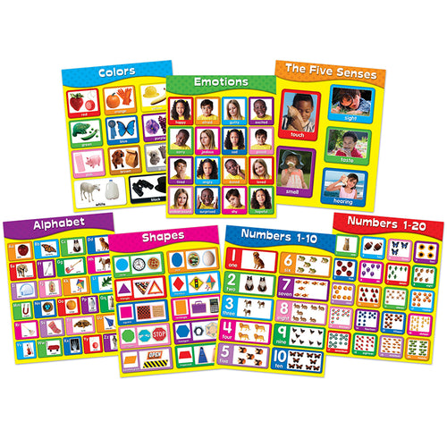 Colors, Emotions, Shapes, and Senses...this colorful Early Learning Chartlet Set has everything you need to brighten up your classroom and provide a helpful reference tool for your students! The set also includes an Alphabet chartlet, as well as Numbers 1-10 and Numbers 1-20. Each chartlet measures 17" x 22" and includes a resource guide on the back.