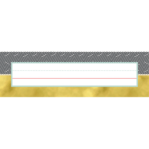 Organizational tools have never looked so stylish. Each of the 36 Aim High desk nameplates features a classic black-and-white pattern and a bold gold stripe. It's the perfect way to personalize in a modern classroom. Label, assign, and organize in style with our convenient desk nameplates. Each pack includes 36 nameplates, each measuring 9.5" x 2.88". Make sure to view our other Aim High products to create a cohesive and contemporary classroom theme.