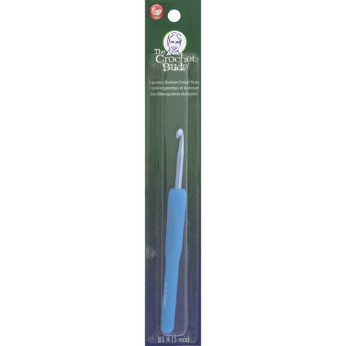 BOYE-The Crochet Dude: Crochet Hook. These ergonomic crochet hooks feature a 1-1/2 inch long aluminum shaft with a padded comfort grip handle that measures 4 inches long (5-1/2 inch total length). The size of the hook is stamped onto the colorful handle for easy identification. Each package contains one crochet hook. Size: US-H (5mm). Imported.