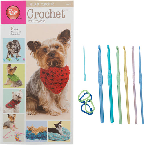 Boye-I Taught Myself To Crochet Pet Clothes. Create cute and easy crochet projects for your pets with this kit! This package contains one book with instructions for eight projects, six crochet hooks in sizes F, G, H, I, J and K, one yarn needle and four carabiner stitch markers. Imported.