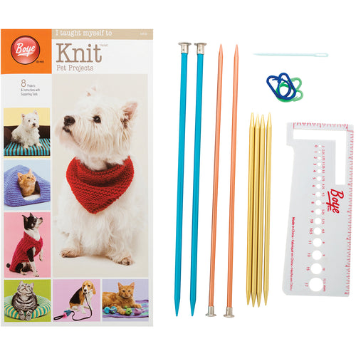 Boye-I Taught Myself To Knit Pet Clothes. Create cute and easy knit projects for your pets with this kit! This package contains one book with instructions for eight projects, two sets of straight knitting needles in sizes US 7 and US 10, a set of four double- point knitting needles in size US 8, one knit gauge, one yarn needle and four carabiner stitch markers. Imported.