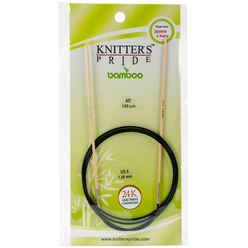 Knitter's Pride-Bamboo Fixed Circular Needles. Bamboo circular needles have high tensile strength, lightweight, strong and flexible. The smooth join ensures easy stitch gliding and no snagging. Cords are flexible and lay flat with no kink or twist. Connectors are 24 Karat Gold plated. This package contains 40 inch long circular needles in size 0/2mm. Imported.