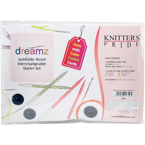 Knitter's Pride-Dreamz Starter Interchangeable Needles Set. The ideal set for completing all your knitting projects! This package contains three interchangeable knitting needles in sizes 6/4mm, 9/5.5mm and 10/6mm, two cords (24 inches and 32 inches), two cord keys and four end caps within one 5-1/2x7-1/2 inch clear vinyl case. Imported.