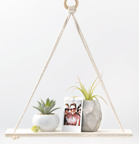 Create a trendy minimalist display for your contemporary living room with this unfinished wood shelf. Customize it with paint and natural embellishments, and use the provided rope and wood rings for hassle-free mounting. This 3.5x12 inch package contains one 12x13.5 inch unfinished wood hanging shelf. WARNING: Choking Hazard. Not suitable for children under 3 years. Imported.