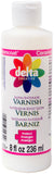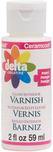 DELTA-Ceramcoat Protect Interior Varnish in 2 or 8 ounces. Waterbased acrylic varnish, great for projects needing interior protection. Use over acrylic and other waterbased paints for a tough finish. Matte gives a no gloss sheen, satin a slight sheen, and gloss a high sheen.