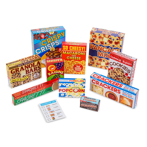 Keep the cupboards stocked with fun! This colorful set of play food boxes makes an engaging pretend-play experience on its own, or perfectly complements a kitchen- or shop-themed play area. Ten boxes of pretend cereal, snacks and sweets assemble easily (in three simple folds!) to create a whole pantry-full of realistic food boxes. Perfect for open-ended creative play, the set also includes play ideas to encourage learning and keep imaginations "cooking." Includes Ten play-food boxes of pretend cereal, snacks and sweets.