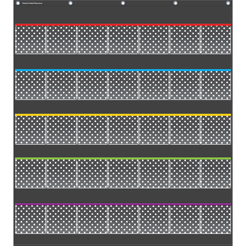 These lightweight and durable pocket charts feature colorful designs and hang easily from sturdy, metal grommets. 35 clear pockets measure 4.5" x 4.5" each and are perfect for organizing small items such as calculators, index cards, cell phones, white board erasers, and manipulatives. Measures 32.5" x 36.5".