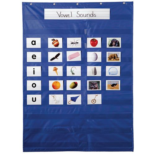This is the perfect pocket chart for playing games, tracking behavior, teaching sight words, and so much more! It includes 10 long pockets and storage. 10 clear pockets Storage pocket on back with hook-and-loop tape closure 31" x 42"