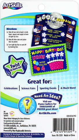 ARTSKILLS-Reusable Poster Lights. This is a fun way to make your project light up! You can have either steady or flashing lights. This package contains one string of twenty LED lights, a punch tool and step-by-step instructions. Requires two AA batteries, not included. Conforms to ASTM D 4236. Imported.