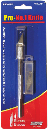 PRO ART-Pro #1 Knife. This pen-style craft knife is great for cutting, trimming, scoring, and carving. It is 5-1/2 inches long (with blade) and has a clear plastic safety cap. Five bonus blades with a storage case are included. This package contains one knife with safety cap, six total blades, and a blade storage case. Imported.