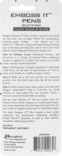 RANGER-Inkssentials Embossing Pens. These fabulous pens contain A specially formulated ink that stays wet on paper, providing The tack needed to attract and retain embossing powders Until they are cured with heat. These pens are perfect for Scrapbooking, rubber stamping, paper crafting, and even Altered arts! Great for resist inking and watermarks also! (1) each: clear and black. Acid free, bullet tip. Made in USA.
