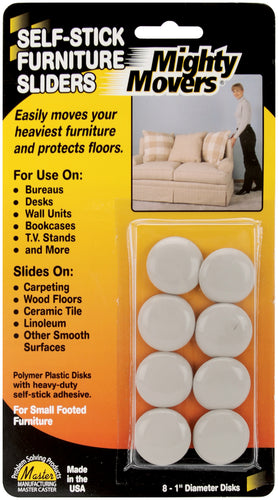 Restor It-Mighty Movers Self Stick Furniture Sliders. These sliders easily moves your heaviest furniture and protects floors! For use on bureaus, desks, wall units, bookcases, T.V. stands and more! This package contains eight .75 inch furniture sliders. Made in USA.