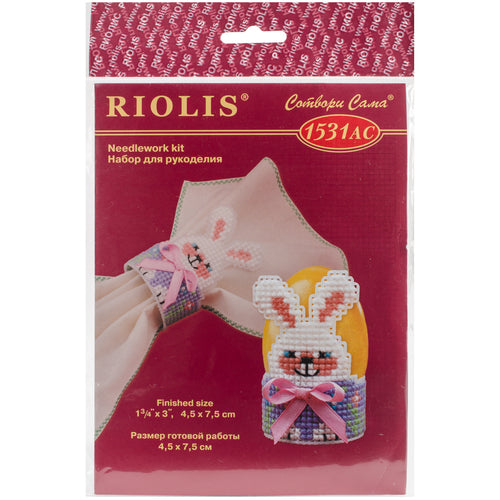 RIOLIS-Counted Cross Stitch Kit. Express your love for arts and crafts with these fun plastic canvas kits! Makes one project. This package contains 10 count plastic canvas, Safil wool/acrylic yarns in six colors, ribbon, one needle, instructions and color chart. Design: Bunny Egg Stand. Finished size: 1.5x2.75 inches. Imported.