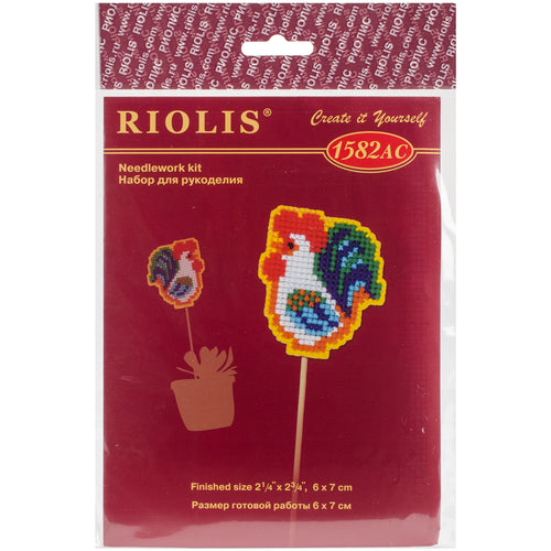 RIOLIS-Counted Cross Stitch Kit. Express your love for arts and crafts with these fun plastic canvas kits! Makes one project. This package contains 10 count plastic canvas, Safil wool/acrylic yarn in seven colors, one needle, beads, beading wire, wooden stick, instructions and color chart. Design: Rooster Planter. Finished size: 2.25x2.75 inches. Imported.