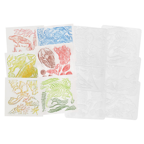 Fossil Rubbing Plates are versatile and fun for art, design, science, geography and much more! This hands-on, easy product is sure to enhance learning concepts. Add texture to artwork by placing paper over a plate and rubbing with a crayon, marker or pencil to make the design emerge. Layer designs for more effects. Fill with or press into modeling clay. Great with paper mache. Make sun catchers using white glue and food color. Simply fill tray and let dry. Peel the resulting mold off and you're done. Each set includes a guide with craft ideas. 6 per pack. 7" x 7" (18 x 18 cm).
