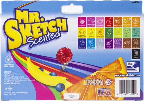 The smooth-flowing bevel-tip makes sketching easier and draws in fine, medium or wide lines. The tip is sturdy to keep its shape even after months of coloring. Each color has its own fun scent that stays even after the ink dries so your keeps smelling as good as it looks! This 8.125x5.75 inch package contains 22 scented markers. Conforms to ASTM D4236. Made in USA.