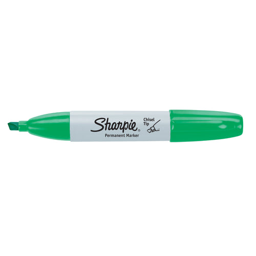Sanford-Sharpie Chisel Tip Permanent Marker: Green. Features a unique anti-roll barrel designed wide-edged tip for both thick and thin marking lines. The durable tip and ergonomic pen-like shape provides comfortable, versatile use. Marker has a pocket clip, chisel tip and quick-drying, alcohol-based ink formula. This package contains one 5-1/2x1 inch chisel tip permanent marker. Conforms to ASTM D 4236. Imported.