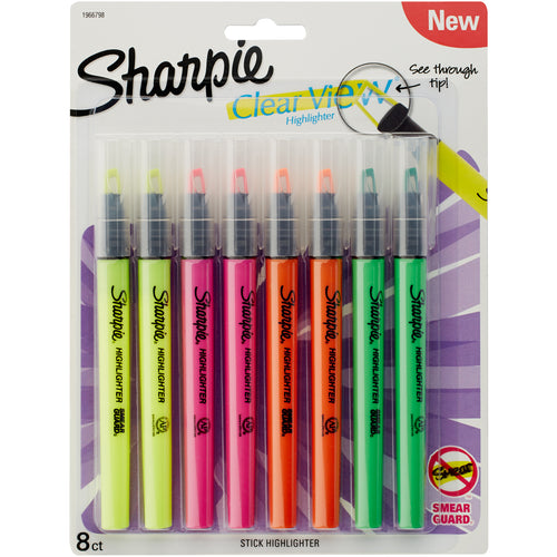 Sanford-Clearview Highlighters: Assorted. Know exactly when to stop highlighting with the help of a see through tip and slim grip. The highlighter features a transparent tip and slender barrel that makes it easy to precisely highlight text. This package contains eight 5 inch Clearview highlighters in four different colors (two of each). Conforms to ASTM D 4236. Imported.
