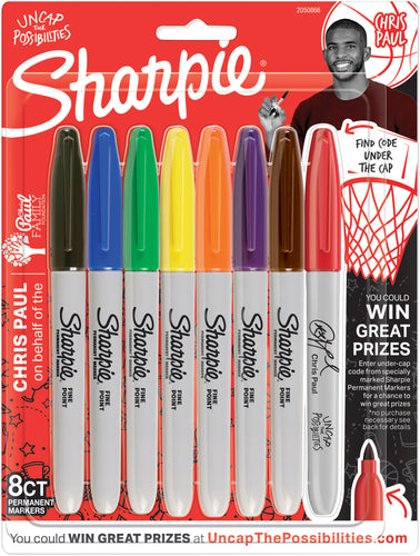 SANFORD-Sharpie Fine Point Permanent Markers Carded: Assorted Colors. Quick-drying, fade and water resistant ink is perfect for all paper crafting project and more! This package contains eight 5-1/2 inch permanent markers (all in different colors) with a fine point. Conforms to ASTM D-4236. Non-toxic. Made in USA.