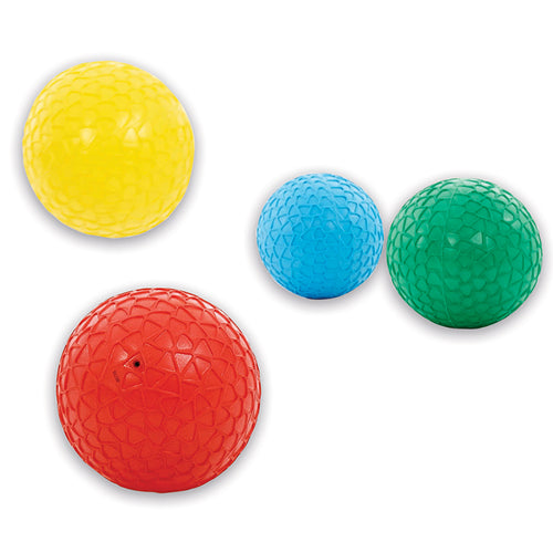 A set of 4 brightly colored inflatable balls with a honeycomb effect surface which aids grip when catching and throwing. The balls are lightweight but sturdy and a good size for young children to handle. Supports the development of motor skills, collaborative and sensory play and hand-eye coordination. The honeycomb surface texture aids grip, making these balls ideal for early practice of throwing and catching. Improves children's confidence with ball skills and hand-eye coordination. Ideal for children aged 0m+.