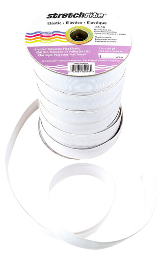 Stretchrite Braided Elastic. The most versatile option available! It is suitable for waistbands, sleeves, necklines, leg bands and more. It is shrink resistant and made of polyester and rubber. This package contains 60 yards of 1 inch wide elastic. Color: White. Made in USA.