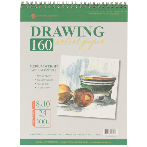 GLOBAL ART-Drawing Pad. This package contains one 8x10 inch drawing pad with twenty-four sheets of 100lb paper. The medium weight and medium texture make it ideal for all dry media, pen and ink drawings, and light wash techniques. The pad is spiral-bound and each page is micro-perforated for easy removal of the full-size sheet. Acid free. Made in USA.