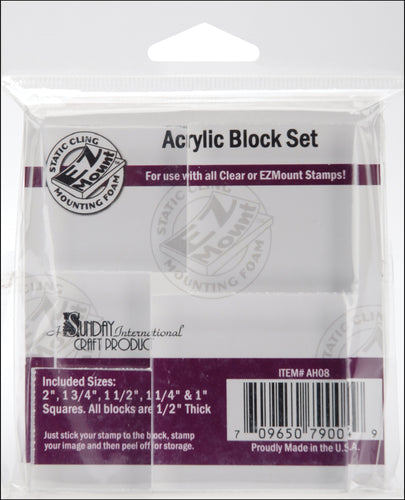 SUNDAY INTERNATIONAL-Acrylic Stamping Block Starter Set. These sets of blocks for clear or unmounted stamps are a great place to start! Each set contains several shapes and sizes of clear blocks for a variety of abilities. This package contains five square blocks: 2in, 1-3/4in, 1-1/2in, 1-1/4in and 1in. Made in USA.
