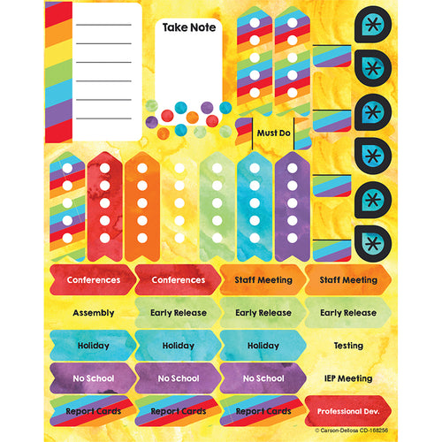 The Celebrate Learning Planner Accents pack contains everything you need to label your daily planner. Organize your planner in style with Carson-Dellosa's planner accents! Use these organizational stickers to add a cheerful touch to planners, to-do lists, notes, and calendars. Shape stickers are acid-free and lignin-free. Look for the coordinating teacher planner to create a cohesive look! This pack includes 6 sheets of 42 die-cut stickers for a total of 252 stickers. This set includes these accents: stickers for noting special days, to-do list stickers, notes, and flag stickers.