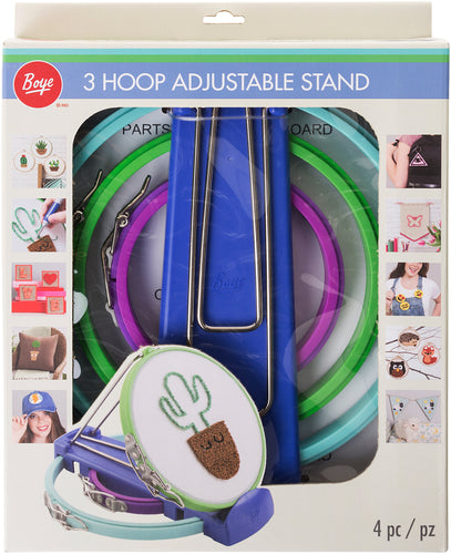 Three different size hoops in one easy to use and store stand. This 10x11.625x1.75 inch package contains one 5 inch hoop, one 7 inch hoop, one 9 inch hoop, one adjustable stand and one sturdy housing base with an easy open spring hinge. Imported.