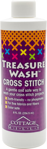 Cottage Mills-Treasure Wash. A gentle and safe way to wash your cross stitch projects! Removes oils and soils gently and effectively. Also effective on older items which have become soiled with time. This package contains 8oz of treasure wash. Made in USA.