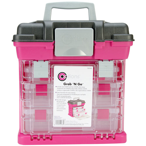 CREATIVE OPTIONS-Grab'n Go 3 By Rack System. This is a great way to store all of your craft supplies and take them on the run in this convenient storage container. Inside are one 2-3650 and two 2-3630 utility boxes. It has a front door for easy viewing and has a top bulk storage area where you can store larger items that won't fit in the smaller utility boxes. This package contains one 13-1/4x10x13- 3/4 inch Grab'n Go 3 By Rack System. Colors: Magenta/Sparkle Gray. Made in USA.
