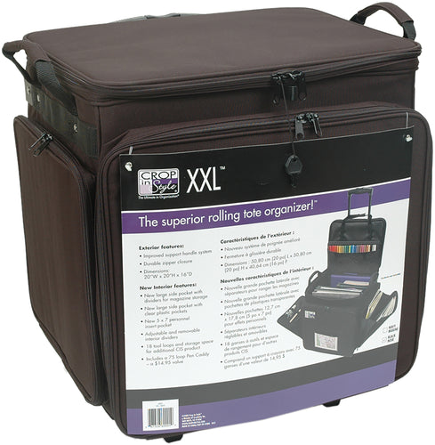 Designed for the ultimate scrapbook enthusiast, this is an excellent tote for those who want to organize and take everything with them. This 14x20 inch package contains one 20x20x16 inch black rolling tote with two inline skate wheels for easy rolling, a telescopic pull-up handle, clear interior pockets within three side zipper pouches for easy visibility, one large storage space with adjustable and/or removable interior dividers, eighteen scissor loops and a seventy-five loop pen caddy. Imported.