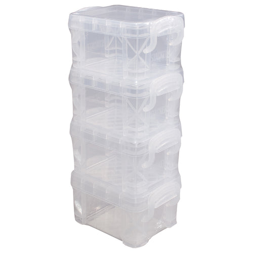 Advantus-Storage Studios Super Stacker Pixie Boxes. Perfect for small items such as brads, eyelets, buttons and beads. These sturdy, stackable boxes feature a hard plastic exterior, secure locking lid and carry handles. They are transparent for quick identification of what is inside and come in assorted colors (each sold separately). This package contains four 2x3-1/4x2-1/4 inch clear super stacker pixie boxes. Imported.