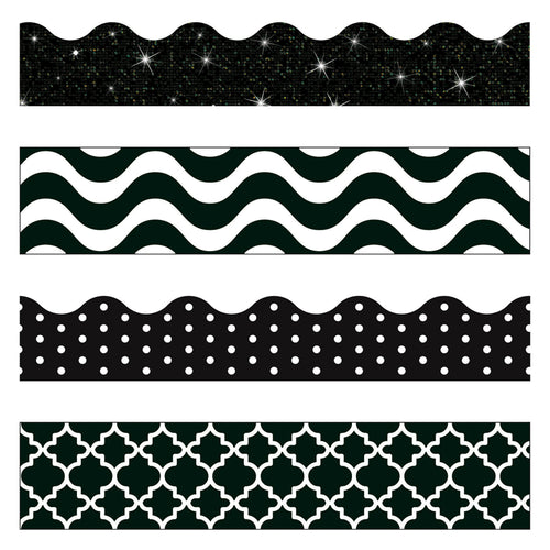 Irresistible designs at your fingertips! Spruce up your spaces and rev up the fun with a convenient Variety Pack of Terrific Trimmers and Bolder Borders. Vibrant, contemporary designs create cheerful, inspiring classrooms, add pizzazz to parties and events, inspire clever hats 'n crowns, and dress up storage containers, cubbies, and shelves. Layer patterns on solids, sparkles, or metallics for extra WOW! Durable and reusable. Includes Black Sparkle Terrific Trimmers, Moroccan Black Bolder Borders, Wavy Black Bolder Borders, and Polka Dots Black Terrific Trimmers. 143'.