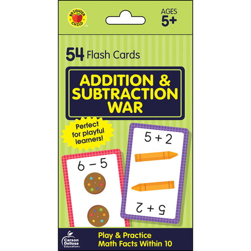 The Addition & Subtraction War Flash Cards for ages 5+ make practicing math facts within 10 exciting and fun by turning equations into the card game war. This set features half addition and half subtraction problems, each represented by different color cards for easy recognition.