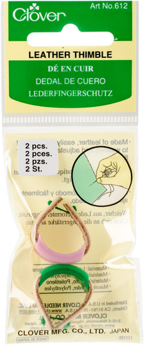 Clover-Leather Thimbles: Adjustable. The leather stretches to fit snug on the finger and will not damage the thread. Just slip the thimble between the second and third joint of the middle finger and place the top of the needle in the indentation for a firm hold on it. This 1.875x4.75 inch package contains two adjustable leather thimbles. Imported.