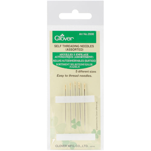 CLOVER-Self Threading Needles: Assorted Sizes. Perfect for sewing both light and heavy fabrics! This package contains five different sized threading needles made of steel (one .64x34.9mm, one .64x42.5mm, one .71x36.5mm, one .76x38mm and one .89x42.5mm). Imported.