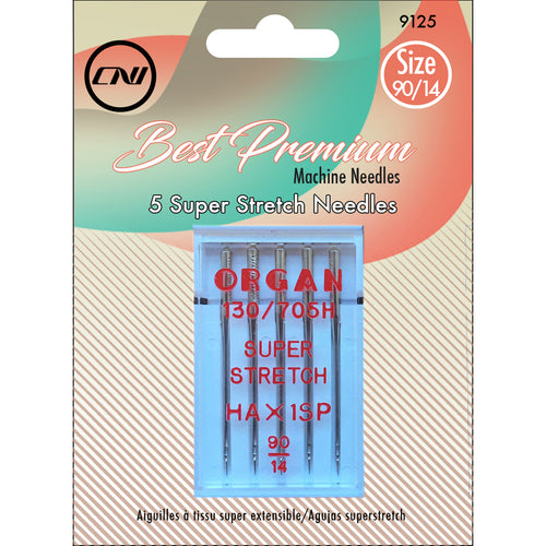 Clover-Super Stretch Needles. The Stretch needle is designed to sew on highly elastic, synthetic and knit fabrics. It is distinguished by its medium ball point, deep scarf and a uniquely shaped eye that holds the thread in position to prevent skipped stitches. The slightly tapered point reduces snags and damage to elastic materials. This package contains five size 90/14 needles. Imported.