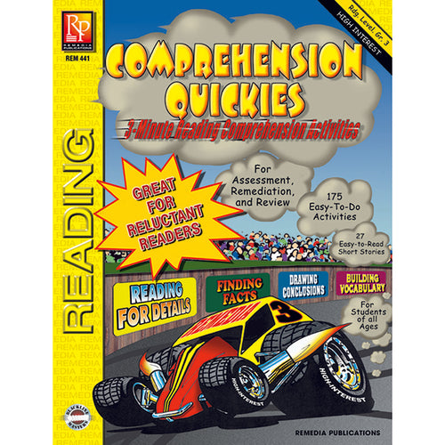 Reluctant readers of all ages and those reading below grade level are sure to have fun while they improve their reading skills with Comprehension Quickies! Very short, easy-to-read paragraphs are followed by comprehension activities that require students to pay attention to details, understand the content, know word definitions, draw conclusions, write complete-sentence answers, and more.