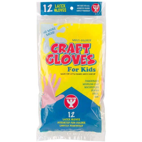 HYGLOSS-Colored Craft Gloves. These colorful latex gloves are specifically sized for kids. They're great for keeping little hands clean when using finger paints, modeling clay, watercolors, crayons, chalk, glue, and various other craft supplies. This package contains twelve lightly-powdered latex gloves in assorted colors. Meets all ASTM standards. Imported.