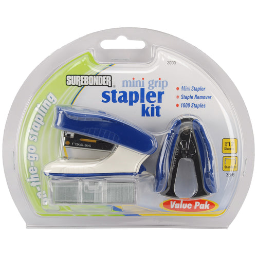 FPC-Surebonder Mini Grip Stapler Kit. This package contains one mini blue and white stapler (1-3/4x3x1in), one blue staple remover (1-5/8x2-1/4x1in), and 1000 staples in a secure and reusable plastic storage box. Uses standard size staples. Imported.
