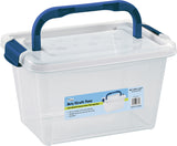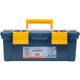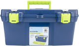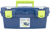 This art storage box features a divided storage area on top for smaller items and a large open compartment inside for storing tools and supplies. This package contains one 19x10x8.9 inch lockable storage box with a five compartment organizer top. Imported.
